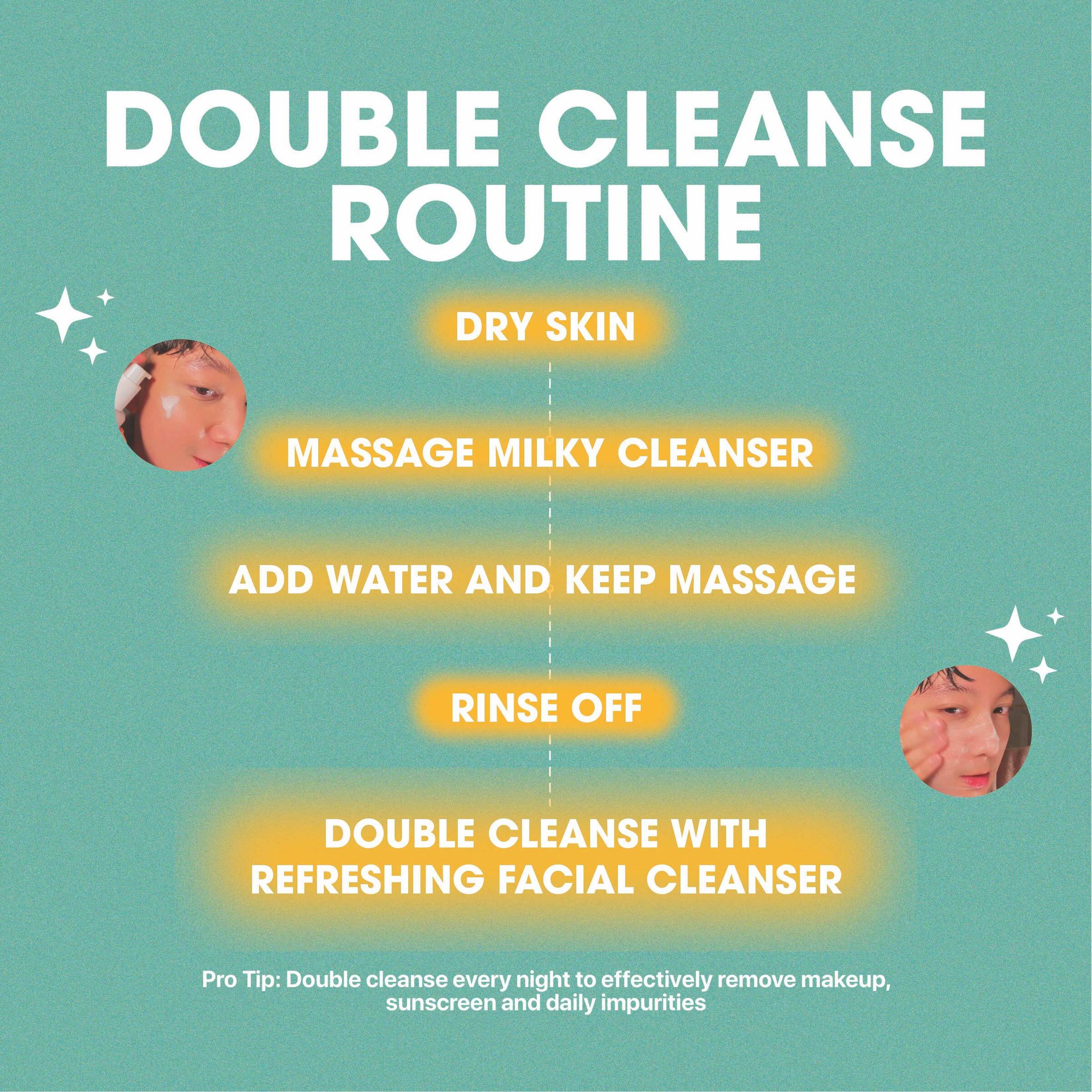 Dispense 2-3 pumps and massage gently on DRY skin to remove makeup, sunscreen and daily impurities. Add a bit of water and continue massage until makeup and grimes are sufficiently melted. Rinse thoroughly.